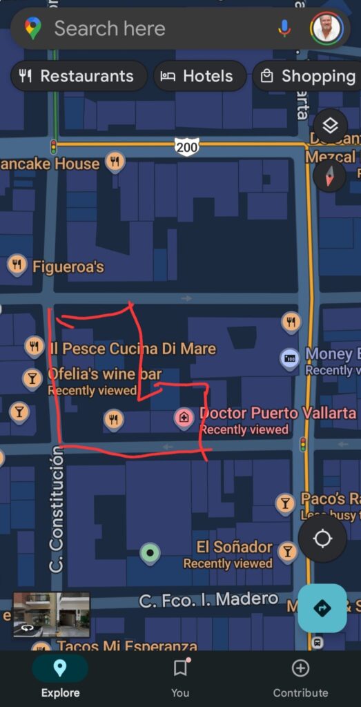 So yeah, the weird thing. So, we were getting ready to head down to Los Muertos for happy hour, and I said to Debbie, hey, let’s take a different route down the hill since we had been favoring the Calle Pulpito route down. It takes about 12 minutes for us to walk from our front door down to Los Muertos. Don’t ask me how I know this. Please. I wouldn’t want anyone to think I have a drinking problem. So, I say to Debbie “if we take the same route all the time, maybe someone will begin to see a pattern and take advantage of us. Like jump us or something. So, Debbie agrees, and we head down the stairway on Aguacate. The Aguacate